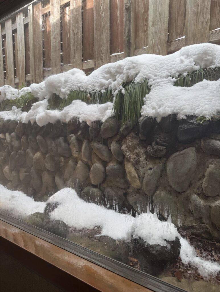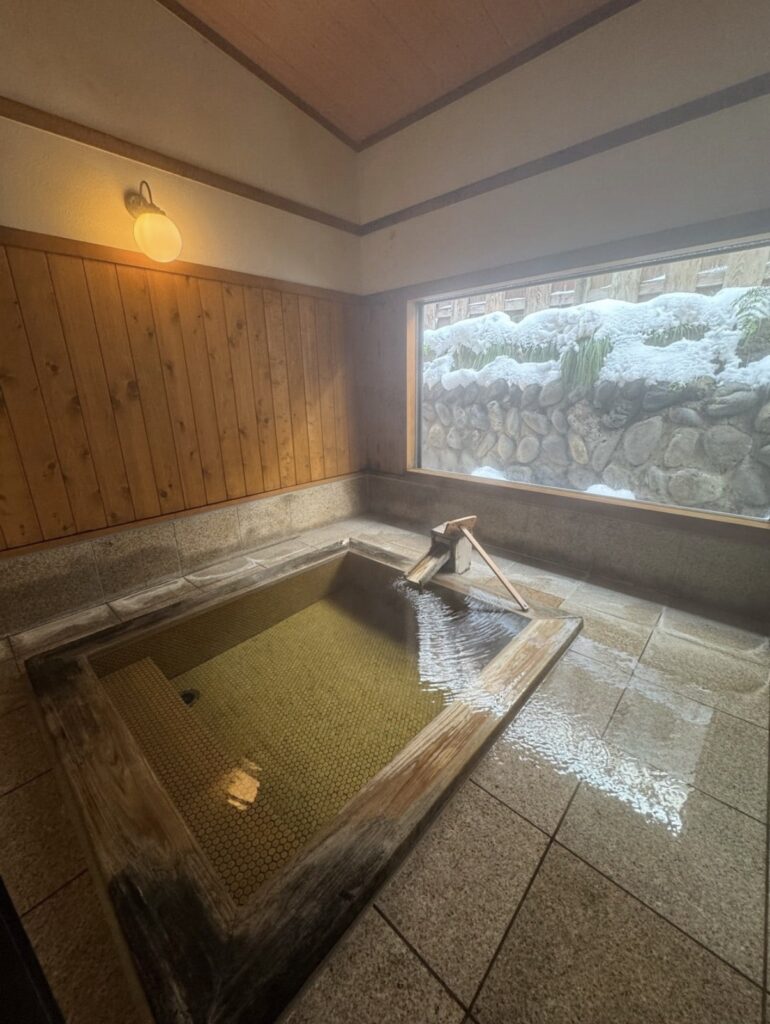 プライベートな空間で、浴槽に浸かりながら雪景色を望めました(壁が近いですが、それもまた隠れ家感があって良いです)。