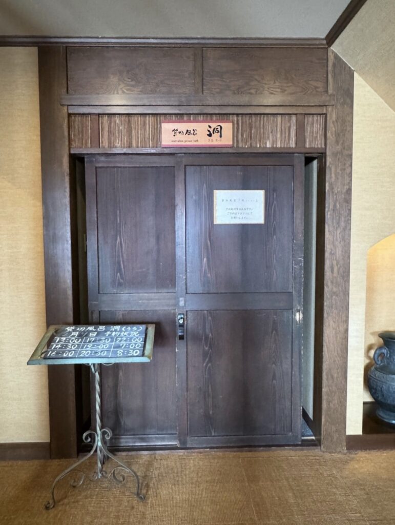 ランチの後に、予約していた**【貸切露天風呂「洞」】**へ。 山水閣にはもう一つ「五葉」という広い貸切風呂(6名まで/有料)もありますが、今回は「洞」を選びました。