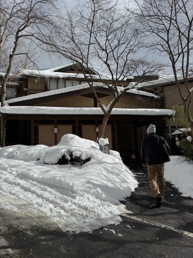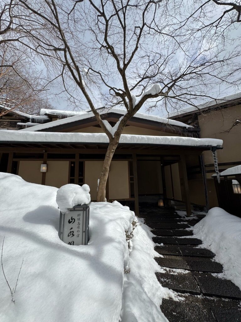 **那須高原の宿「山水閣」**に到着です。雪に覆われた風情ある佇まいに、期待が高まります。