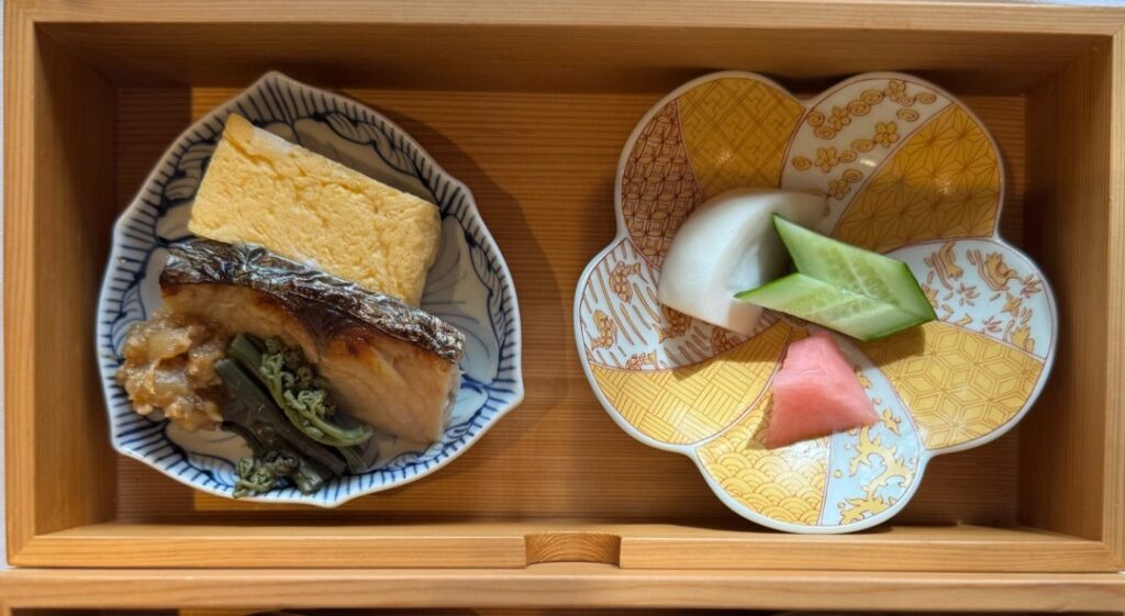 - 焼き物・玉子: 厚焼き玉子、牛蒡味噌、鰆の幽庵焼き、わらび。